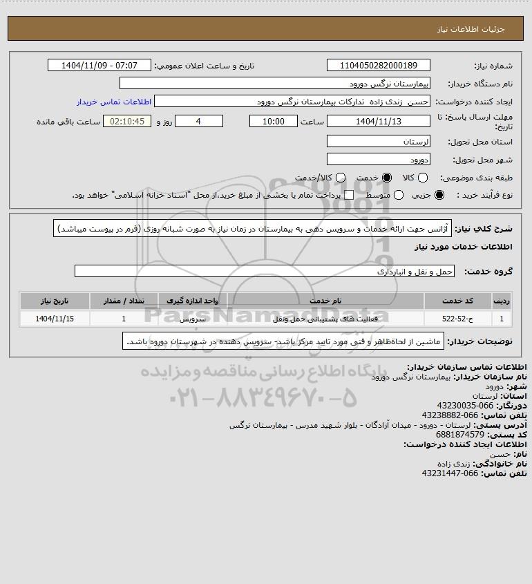 شرح کلی نیاز: آژانس جهت ارائه خدمات و سرویس دهی به بیمارستان در زمان نیاز به صورت شبانه روزی (فرم در پیوست میباشد)