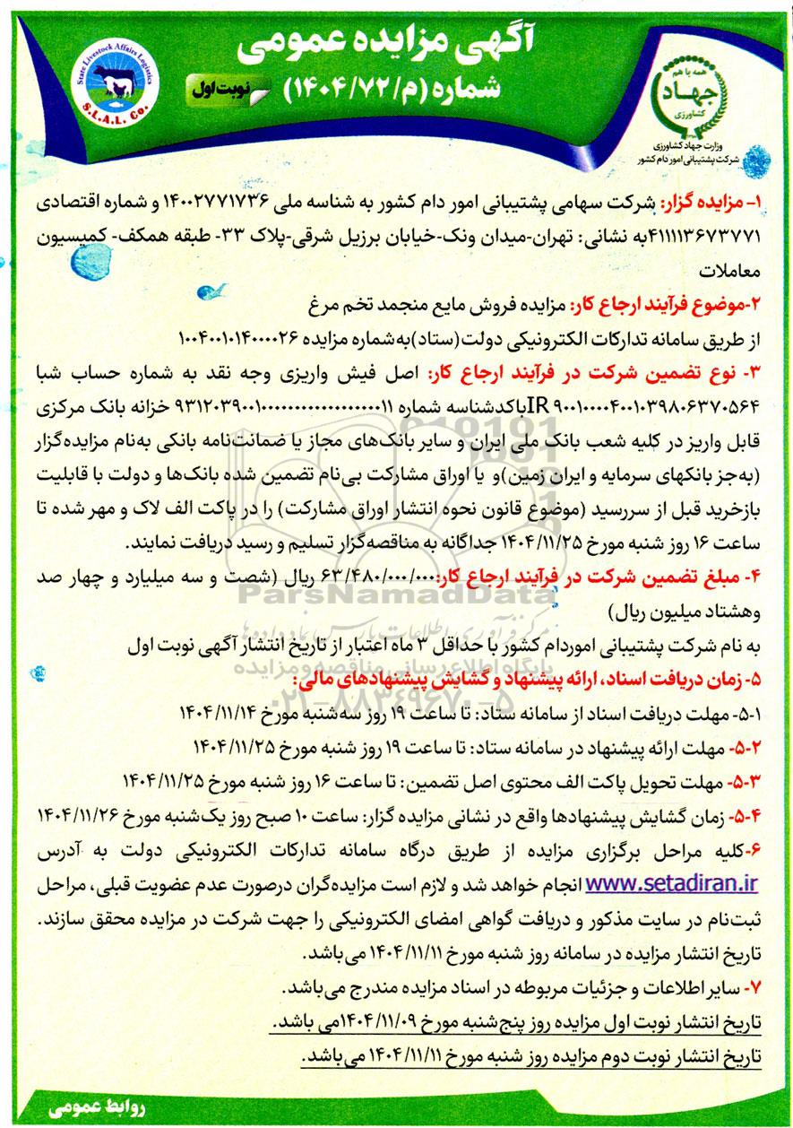 مزایده فروش مایع منجمد تخم مرغ -مزایده روز پنجشنبه نهم بهمن ماه 1404, مزایده فروش مایع منجمد تخم مرغ