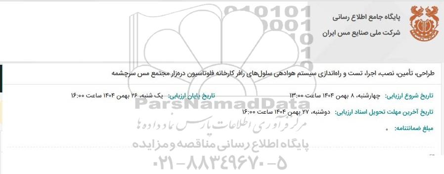 مناقصه طراحی، تامین، نصب، اجرا، تست و راه اندازی سیستم هوادهی سلول های رافر کارخانه فلوتاسیون دره زار مجتمع مس سرچشمه  -مناقصه روز پنجشنبه نهم بهمن ماه 1404 از کلیه افراد متخصص و شرکت‌ها واجد شرایط دعوت به عمل می‌آید در مناقصه با کد خبرگزاری پارس نماد: 10214870 شرکت نمایند. این مناقصه در تاریخ 1404/11/09 شروع و مهلت آن تا تاریخ 1404/11/26 میباشد.