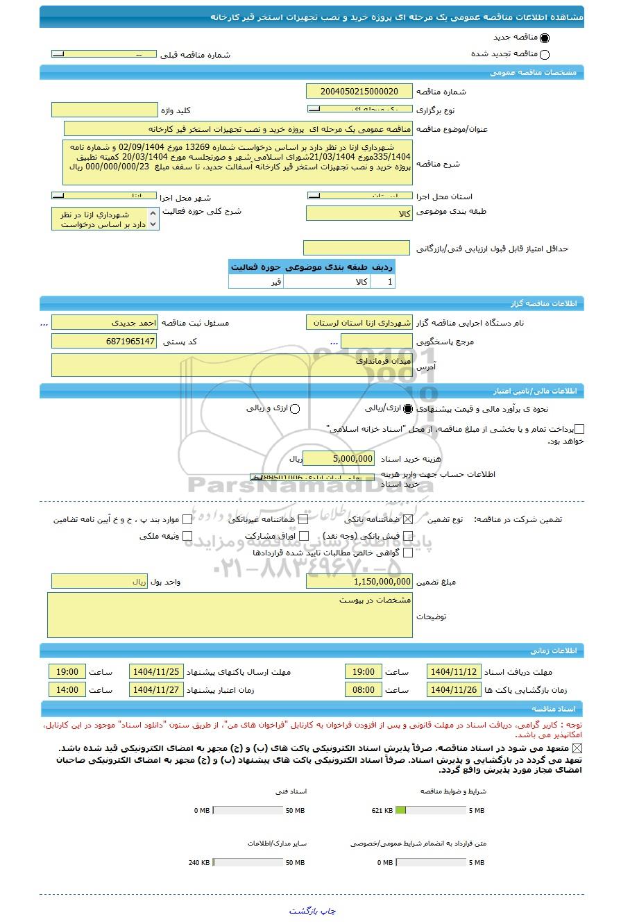 | نام دستگاه اجرایی مناقصه گزار | شهرداری ازنا استان لرستان | مسئول ثبت مناقصه | احمد جدیدی |