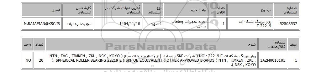 52508537رولر بیرینگ بشکه ای 22219 E 1خرید تجهیزات وقطعات یدکیکشوری1404/11/10محمدرضا رجائیانM.RAJAEIAN@KSC.IR