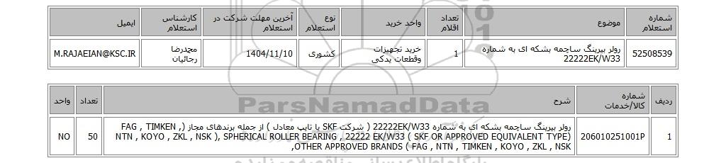 | 52508539 | رولر بیرینگ ساچمه بشکه ای به شماره 22222EK/W33 | 1 | خرید تجهیزات وقطعات یدکی | کشوری | 1404/11/10 | محمدرضا رجائیان | M.RAJAEIAN@KSC.IR |