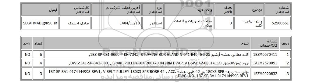 | 52508561 | چرخ - پولی - گلند | 3 | ساخت تجهیزات و قطعات یدکی | استانی | 1404/11/10 | صادق احمدی | SD.AHMADI@KSC.IR |