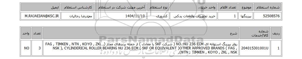 | 52508576 | بیرینگها | 1 | خرید تجهیزات وقطعات یدکی | کشوری | 1404/11/10 | محمدرضا رجائیان | M.RAJAEIAN@KSC.IR |
