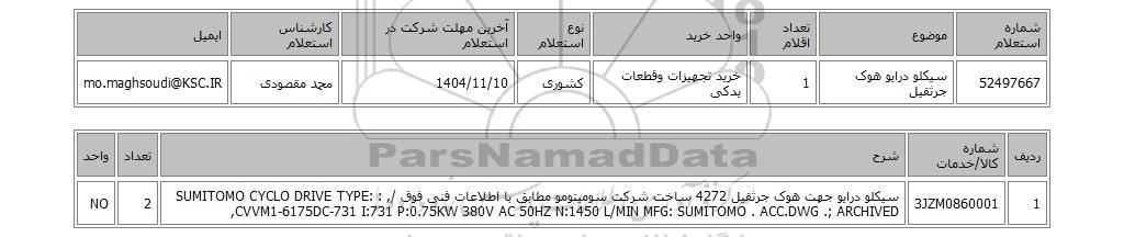 | 52497667 | سیکلو درایو هوک جرثقیل | 1 | خرید تجهیزات وقطعات یدکی | کشوری | 1404/11/10 | محمد مقصودی | mo.maghsoudi@KSC.IR |