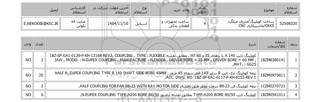 | 52508320 | ساخت کوپلینگ/متریال میلگرد CK45/ماشینکاری CNC | 4 | ساخت تجهیزات و قطعات یدکی | استانی | 1404/11/10 | عنایت اله نکوئی | E.NEKOOIE@KSC.IR |