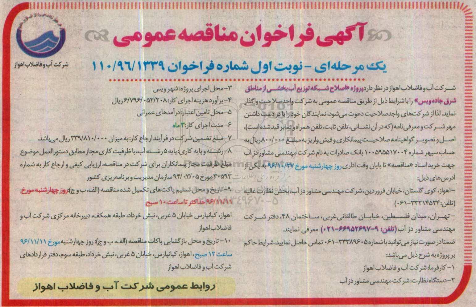 شرکت آب و فاضلاب اهواز در نظر دارد پروژه اصلاح شبکه توزیع آب بخشی از مناطق شرق جاده ویس را با شرایط ذیل از طریق مناقصه عمومی به شرکت واجد صلاحیت واگذار نماید. لذا از شرکت های واجد صلاحیت دعوت می شود نمایندگان خوئد را با در دست داشتن مهر شرکت و معرفی نامه (که در آن نشانی، تلفن ثابت، تلفن همراه و نمابر قید شده است)، اصل و تصویر گواهینامه صلاحیت پیمانکاری و فیش واریز به مبلغ 800.000 ریال به حساب سپهر شماره 100595517004 بانک صادرات به نام شرکت مهندسی مشاور دز آب جهت خرید اسناد مناقصه تا پایان وقت اداری روز چهارشنبه مورخ 96.10.27 به یکی از آدرس های ذیل: