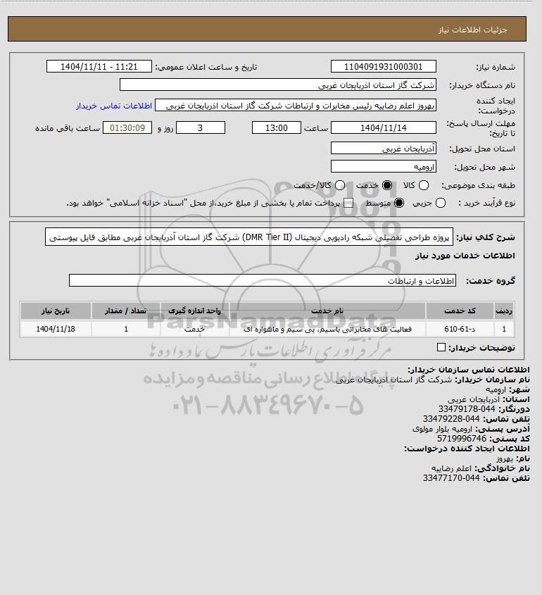 شرح کلی نیاز: پروژه طراحی تفصیلی شبکه رادیویی دیجیتال (DMR Tier II) شرکت گاز استان آذربایجان غربی مطابق فایل پیوستی
