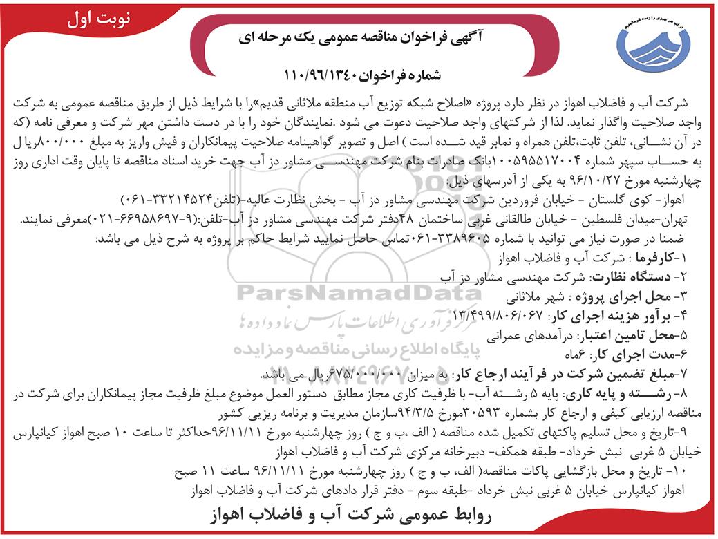 شرکت آب و فاضلاب اهواز در نظر دارد پروژه اصلاح شبکه توزیع آب منطقه ملاثانی قدیم را با شرایط ذیل از طریق مناقصه عمومی به شرکت واجد صلاحیت واگذار نماید. لذا از شرکت های واجد صلاحیت دعوت می شود نمایندگان خود را با در دست داشتن مهر شرکت و معرفی نامه (که در آن نشانی، تلفن ثابت، تلفن همراه و نمابر قید شده است)، اصل و تصویر گواهینامه صلاحیت پیمانکاری و فیش واریز به مبلغ 800.000 ریال به حساب سپهر شماره 100595517004 بانک صادرات به نام شرکت مهندسی مشاور دز آب جهت خرید اسناد مناقصه تا پایان وقت اداری روز چهارشنبه مورخ 96.10.27 به یکی از آدرس های ذیل: