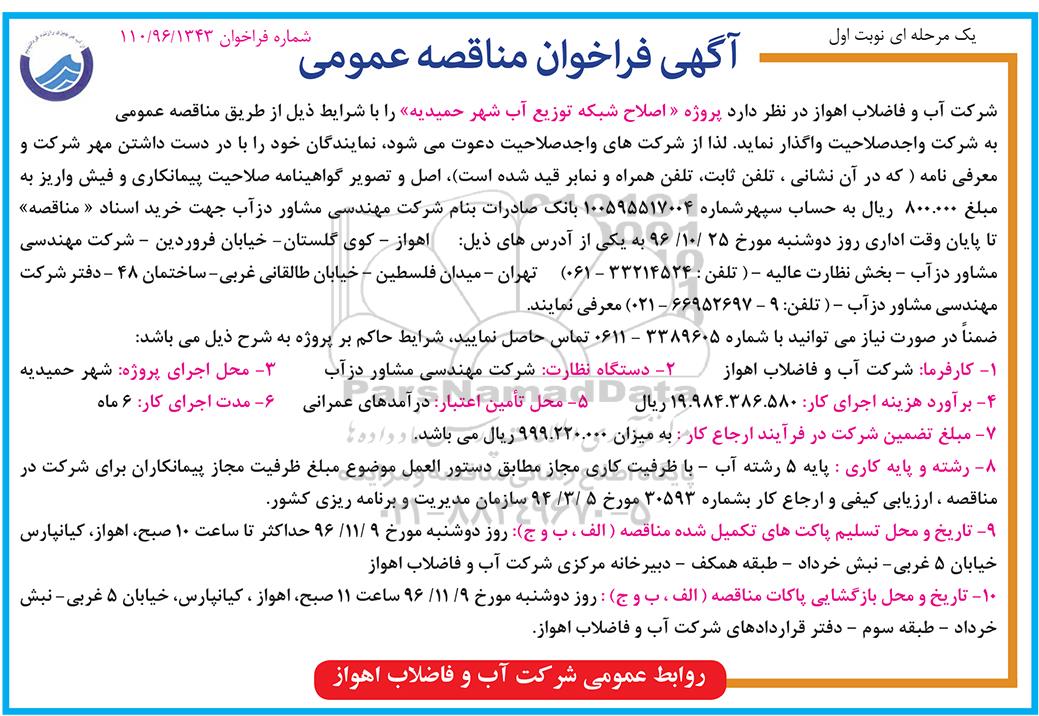 شرکت آب و فاضلاب اهواز در نظر دارد پروژه اصلاح شبکه توزیع آب شهر حمیدیه را با شرایط ذیل از طریق مناقصه عمومی به شرکت واجد صلاحیت واگذار نماید. لذا از شرکت های واجد صلاحیت دعوت می شود نمایندگان خوئد را با در دست داشتن مهر شرکت و معرفی نامه (که در آن نشانی، تلفن ثابت، تلفن همراه و نمابر قید شده است)، اصل و تصویر گواهینامه صلاحیت پیمانکاری و فیش واریز به مبلغ 800.000 ریال به حساب سپهر شماره 100595517004 بانک صادرات به نام شرکت مهندسی مشاور دز آب جهت خرید اسناد مناقصه تا پایان وقت اداری روز دوشنبه مورخ 96.10.25 به یکی از آدرس های ذیل: