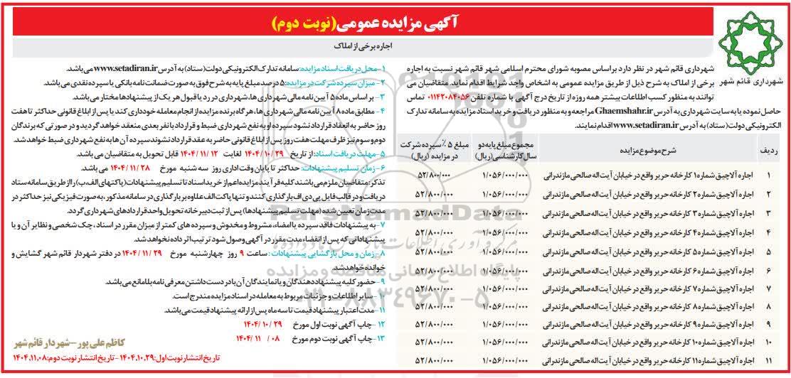 مزایده اجاره املاک / نوبت دوم -مزایده روز شنبه یازدهم بهمن ماه 1404, مزایده اجاره املاک / نوبت دوم