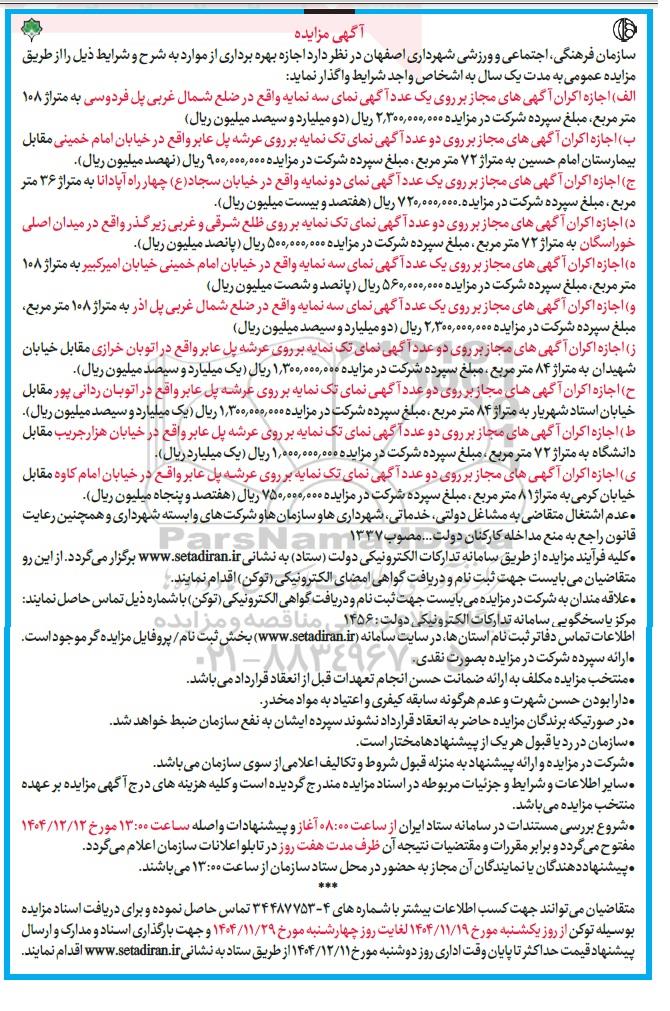 سازمان فرهنگی اجتماعی و ورزشی شهرداری اصفهان در نظر دارد اجازه بهره برداری از موارد به شرح و شرایط ذیل را از طریق مزایده عمومی به مدت یک سال به اشخاص واجد شرایط واگذار نماید