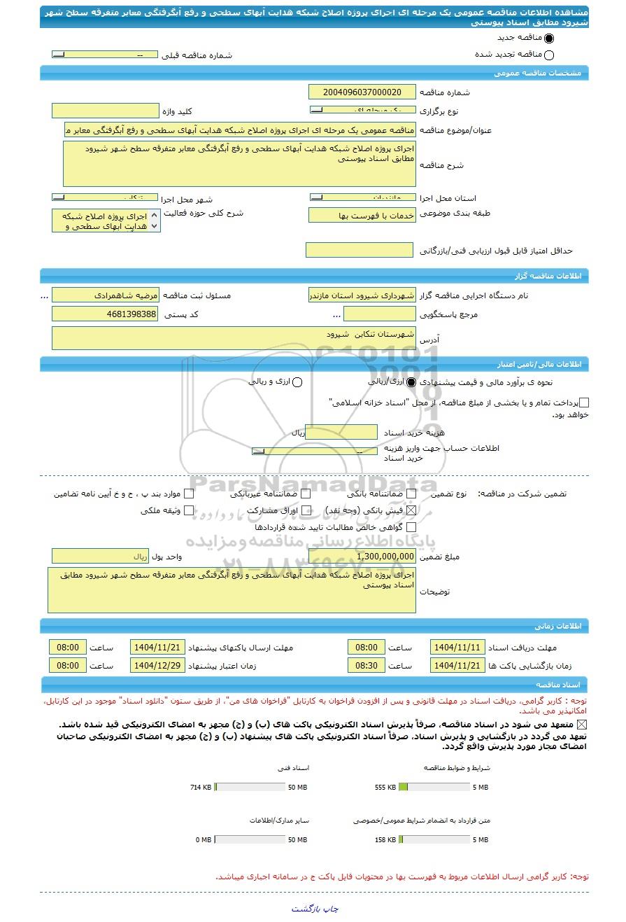 عنوان/موضوع مناقصهمناقصه عمومی یک مرحله ای اجرای پروژه اصلاح شبکه هدایت آبهای سطحی و رفع آبگرفتگی معابر متفرقه سطح شهر شیرود مطابق اسناد پیوستی