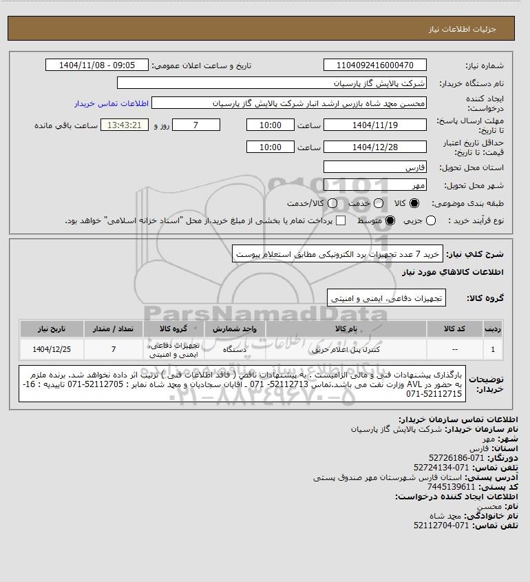 نام دستگاه خریدار:شرکت پالایش گاز پارسیان