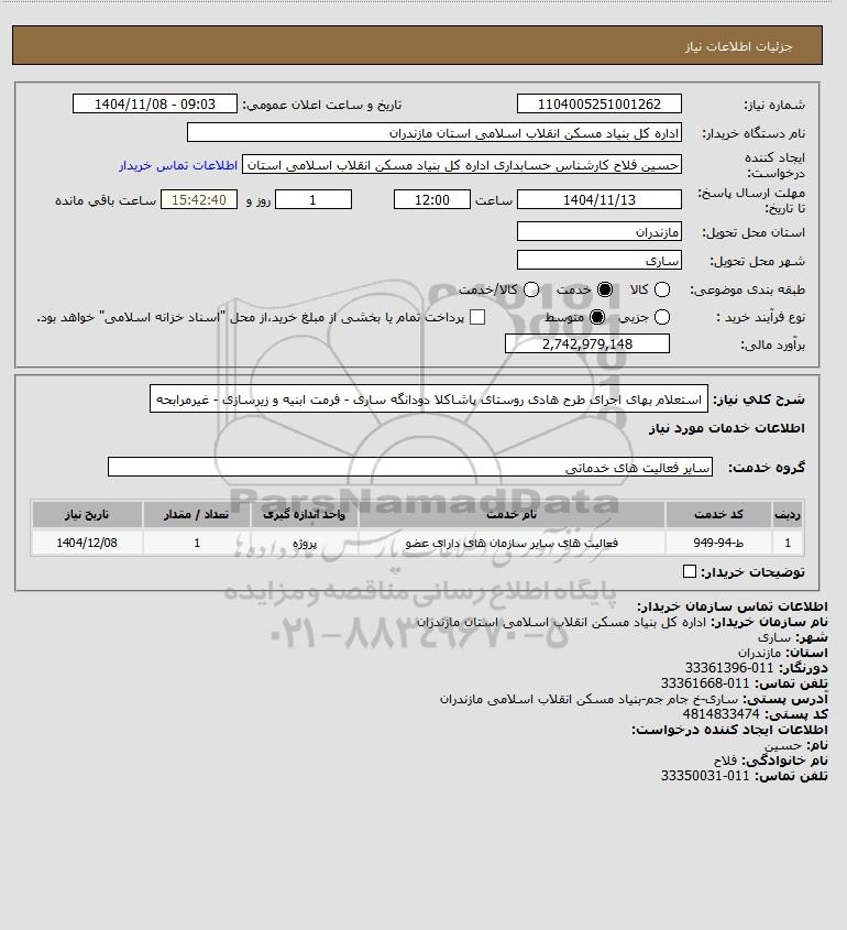 شرح کلی نیاز: استعلام بهای اجرای طرح هادی روستای پاشاکلا دودانگه ساری - فرمت ابنیه و زیرسازی - غیرمرابحه
