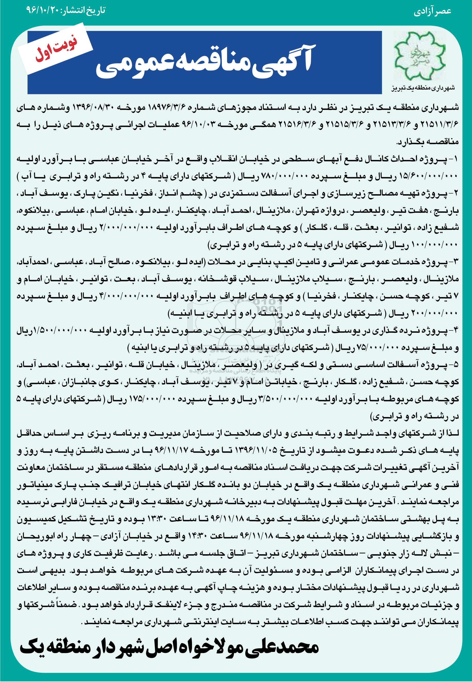 شهرداری منطقه یک تبریز در نظر دارد به استناد مجوزهای شماره 18976/3/6 مورخه 96.8.30 و شماره های 21511/3/6 و 21513/3/6 و 21515/3/6 و 21516/3/6 همگی مورخه 96.10.3 عملیات اجرائی پروژه های ذیل را به مناقصه بگذارد.