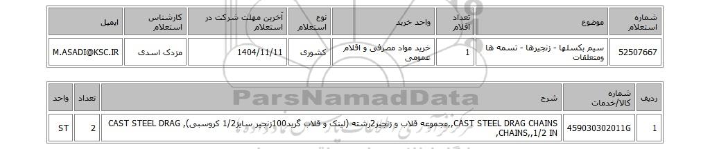 | 52507667 | سیم بکسلها - زنجیرها - تسمه ها ومتعلقات | 1 | خرید مواد مصرفی و اقلام عمومی | کشوری | 1404/11/11 | مزدک اسدی | M.ASADI@KSC.IR |