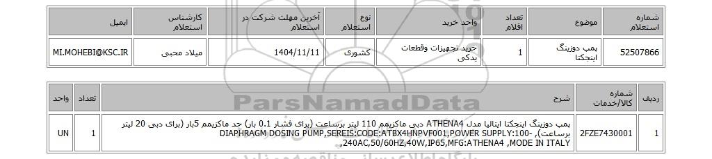 | 52507866 | پمپ دوزینگ اینجکتا | 1 | خرید تجهیزات وقطعات یدکی | کشوری | 1404/11/11 | میلاد محبی | MI.MOHEBI@KSC.IR |