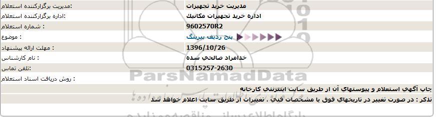 استعلام بها و موضوع استعلام استعلام, استعلام پنج ردیف بیرینگ به اطلاع کلیه شرکتها و افراد متخصص واجد شرایط میرساند، آگهی گذار در نظر دارد از طریق استعلام بها، نسبت به انتخاب و دریافت پیشنهادات اقدام نماید. این استعلام با کد آگهی ثبت شده در سامانه خبرگزاری پارس نماد : 1022513 منتشر شده است. مشخصات استعلام : تاریخ شروع استعلام: 1396/10/20 آخرین مهلت ارسال پیشنهاد قیمت : 1396/10/26 و محل اجرای پروژه : استان اصفهان میباشد. استعلام قیمت مورد درخواست : استعلام, استعلام پنج ردیف بیرینگ با دستهبندیهای تخصصی و گروه های مرتبط : انواع بلبرینگ و رولبرینگ, تجهیزات و ماشین آلات صنعتی, استعلام اطلاع رسانی میگردد.