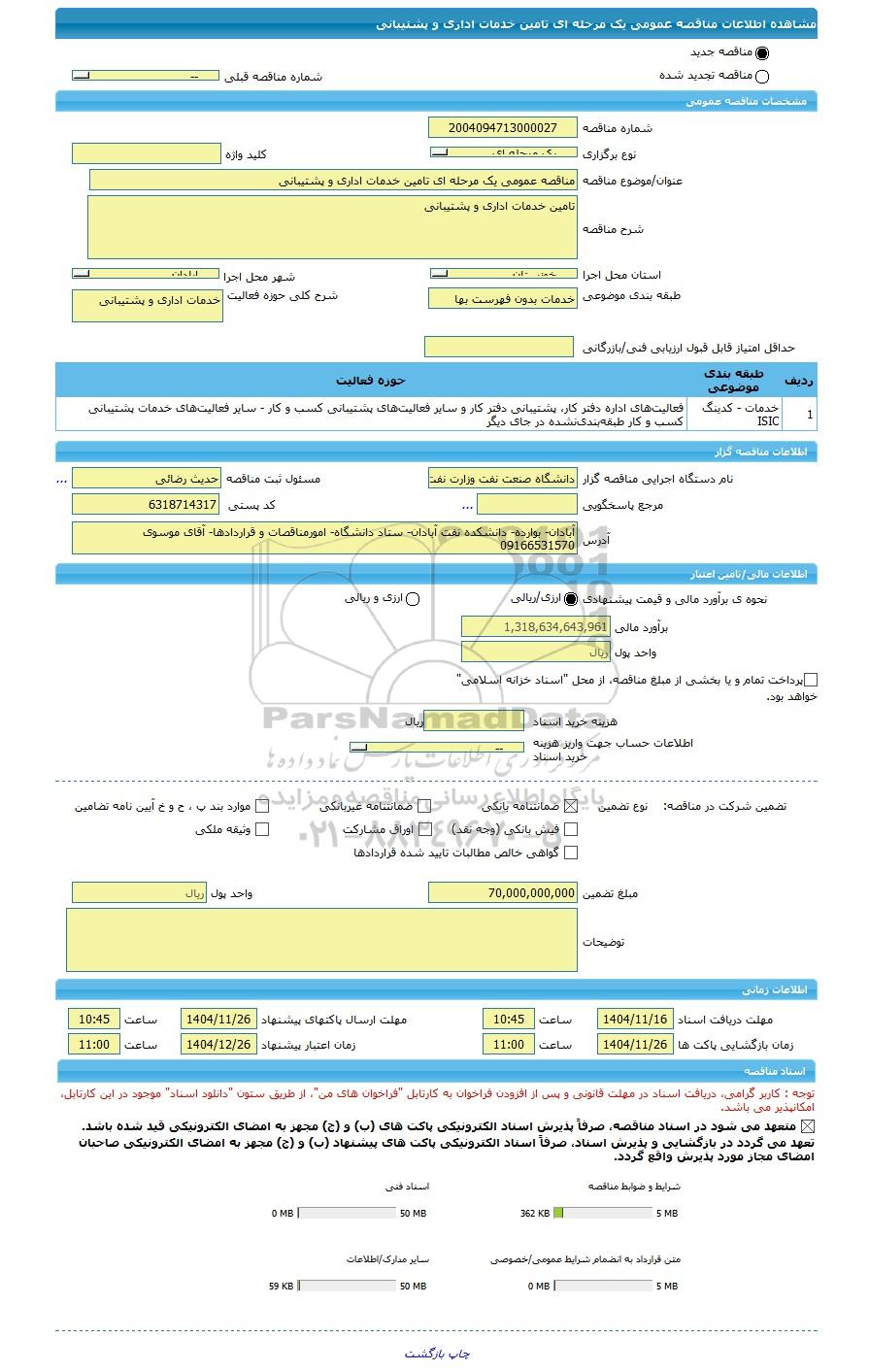 | زمان بازگشایی پاکت ها | 1404/11/26 | تا تاریخ | 11:00 | زمان اعتبار پیشنهاد | 1404/12/26 | تا ساعت | 11:00 |