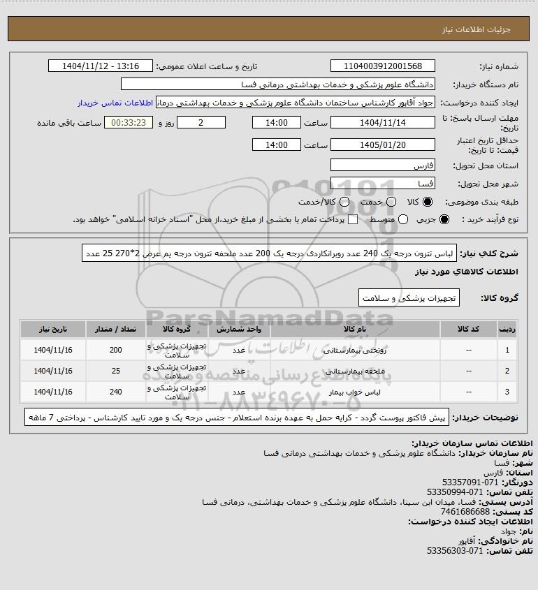 | 3 | -- | لباس خواب بیمار | عدد | تجهیزات پزشکی و سلامت | 240 | 1404/11/16 |