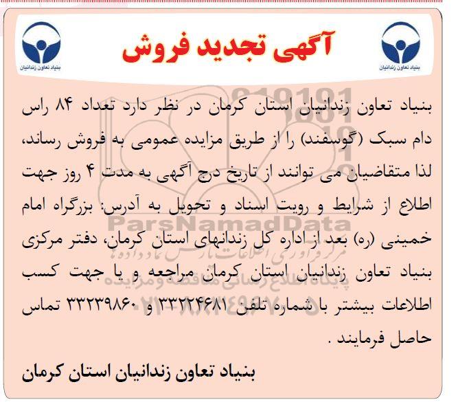 بنیاد تعاون زندانیان استان کرمان در نظر دارد تعداد 84 راس دام سبک (گوسفند) را از طریق مزایده عمومی به فروش رساند، لذا متقاضیان می توانند از تاریخ درج آگهی به مدت 7 روز جهت اطلاع از شرایط و رویت اسناد و تحویل به آدرس : بزرگراه امام خمینی (ره) - بعد از اداره کل زندان های استان کرمان، دفتر مرکزی بنیاد تعاون زندانیان استان کرمان مراجعه و یا جهت کسب اطلاعات بیشتر با شماره تلفن 33224681 و 33239860 تماس حاصل فرمایند.