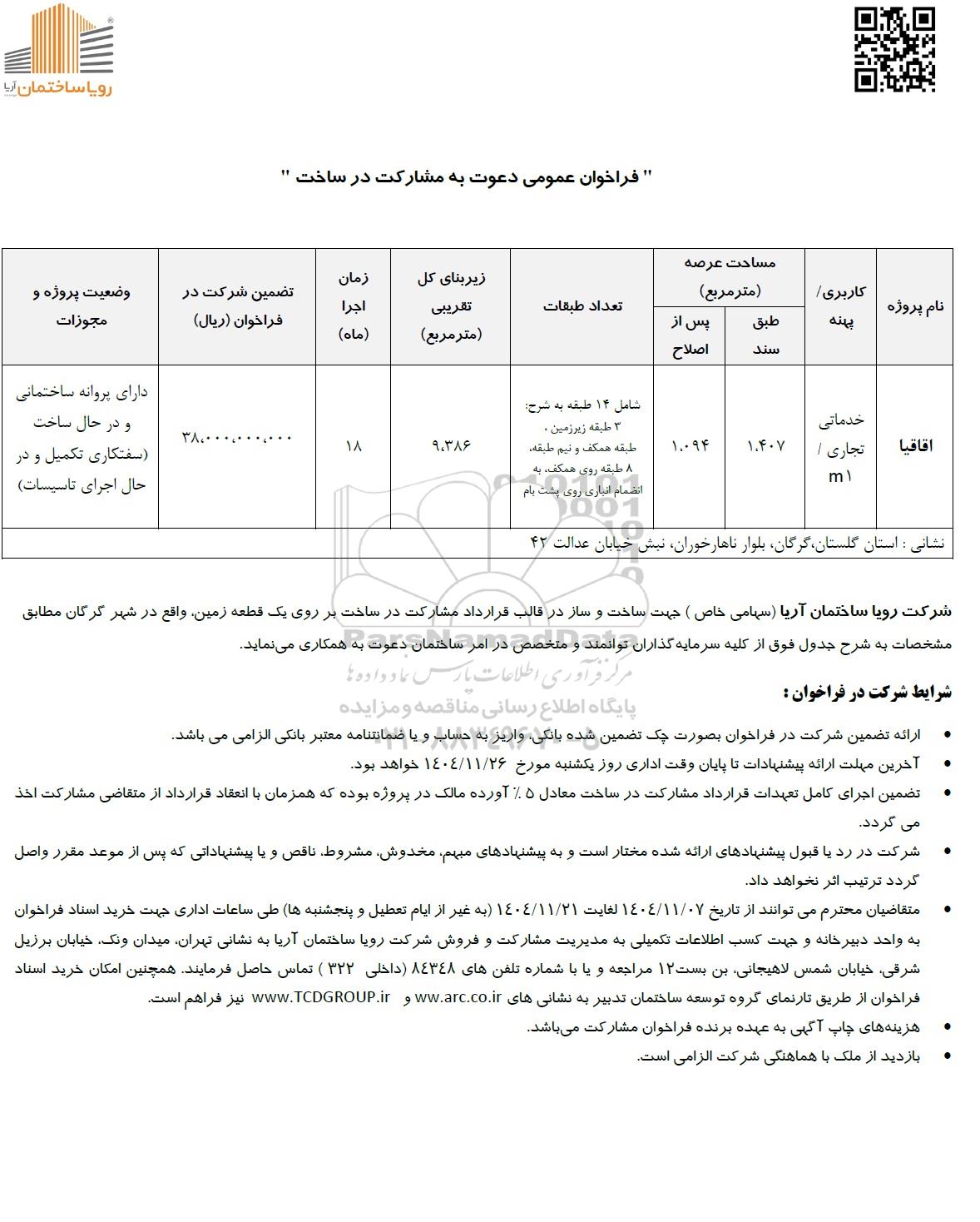 شرکت رویا ساختمان آریا (سهامی خاص) جهت ساخت و ساز در قالب قرارداد مشارکت در ساخت بر روی یک قطعه زمین، واقع در شهر گرگان مطابق مشخصات به شرح جدول فوق از کلیه سرمایه گذاران توانمند و متخصص در امر ساختمان دعوت به همکاری می نماید.