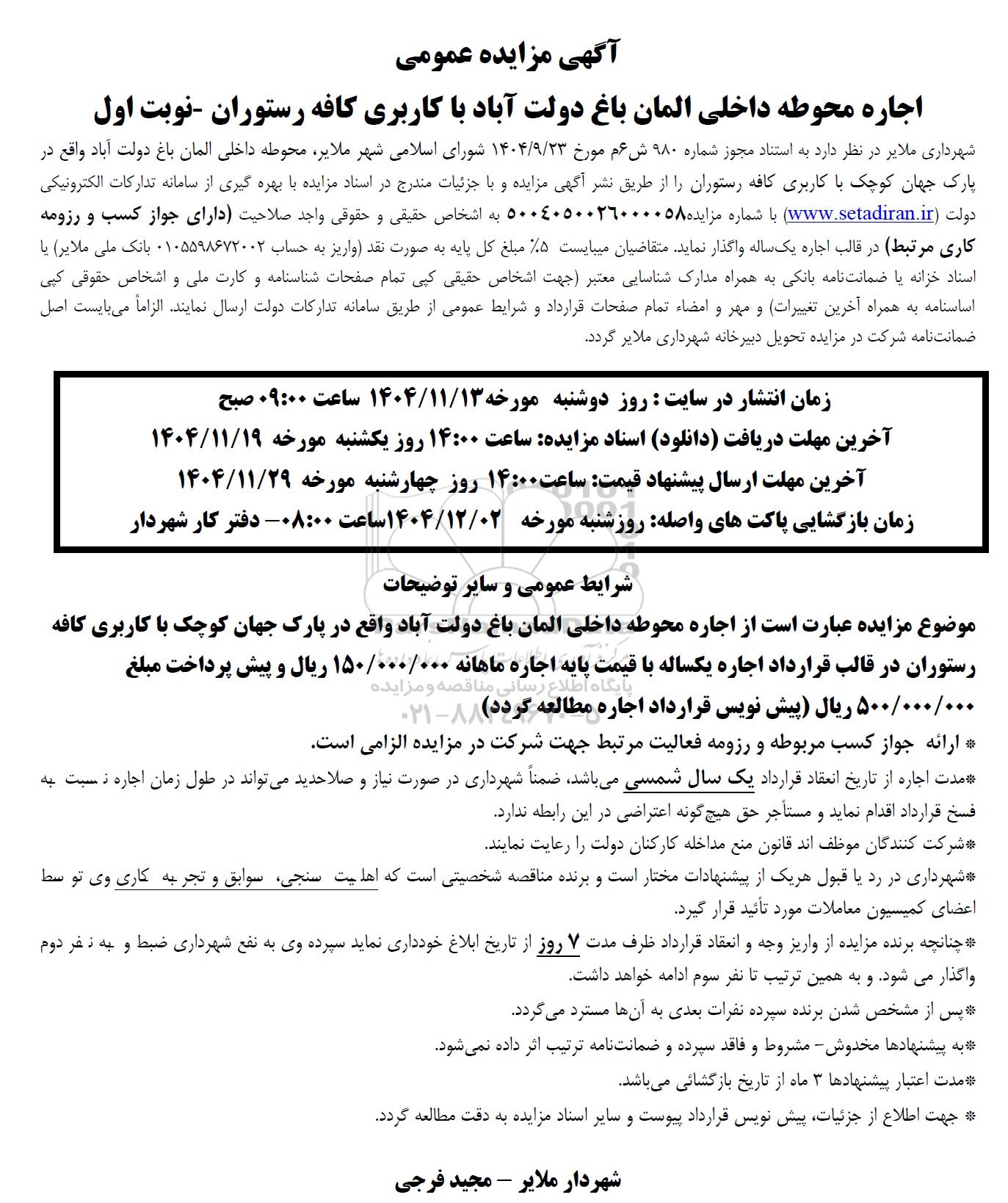 شهرداری ملایر در نظر دارد به استناد مجوز شماره 980 ش 6 م مورخ 1404.9.23 شورای اسلامی شهر ملایر، محوطه داخلی آلمان باغ دولت آباد واقع در پارک جهان کوچک با کاربری کافه رستوران را از طریق نشر آگهی مزایده و با جزئیات مندرج در اسناد مزایده با بهره گیری از سامانه تدارکات الکترونیکی دولت با شماره مزایده 5004050026000058 به اشخاص حقیقی و حقوقی واجد صلاحیت (دارای جواز کسب و رزومه کاری مرتبط) در قالب اجاره یک ساله واگذار نماید. متقاضیان میبایست 5 مبلغ کل پایه به صورت نقد (واریز به حساب 0105598672002 بانک ملی ملایر) یا اسناد خزانه یا ضمانت نامه بانکی به همراه مدارک شناسایی معتبر (جهت اشخاص حقیقی کپی تمام صفحات شناسنامه و کارت ملی و اشخاص حقوقی کپی اساسنامه به همراه آخرین تغییرات) و مهر و امضاء تمام صفحات قرارداد و شرایط عمومی از طریق سامانه تدارکات دولت ارسال نمایند. الزاماً می بایست اصل ضمانت نامه شرکت در مزایده تحویل دبیرخانه شهرداری ملایر گردد.
