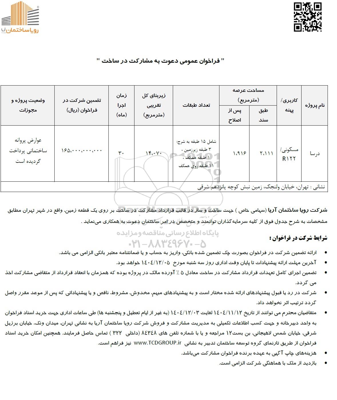 * متقاضیان محترم می توانند از تاریخ 1404.11.12 لغایت 1404.12.03 (به غیر از ایام تعطیل و پنجشنبه ها ) طی ساعات اداری جهت خرید اسناد فراخوان به واحد دبیرخانه و جهت کسب اطلاعات تکمیلی به مدیریت املاک، مشارکت و فروش شرکت رویا ساختمان آریا به نشانی: تهران، میدان ونک، خیابان برزیل شرقی ، خیابان شمس لاهیجانی، بن بست 12 مراجعه و یا با شماره تلفن 84348 (داخلی 322) تماس حاصل فرمایند. همچنین امکان خرید اسناد فراخوان از طریق تارنمای گروه توسعه ساختمان تدبیر به نشانی www.TCDGROUP.ir نیز فراهم است.