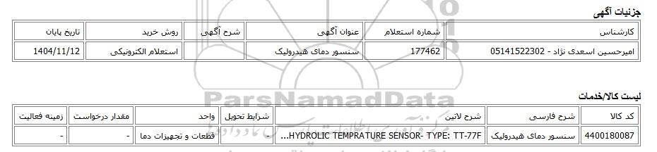 امیرحسین اسعدی نژاد - 05141522302177462سنسور دمای هیدرولیکاستعلام الکترونیکی1404/11/12