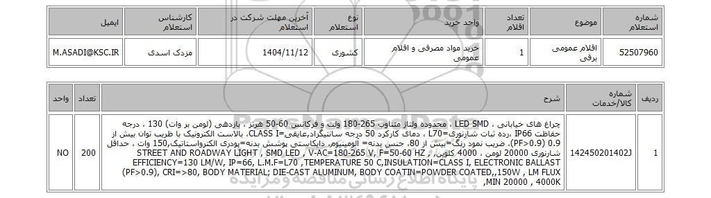 | 52507960 | اقلام عمومی برقی | 1 | خرید مواد مصرفی و اقلام عمومی | کشوری | 1404/11/12 | مزدک اسدی | M.ASADI@KSC.IR |