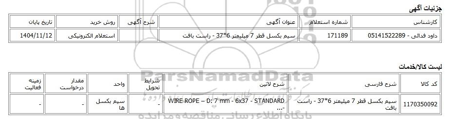 | داود فدائی - 05141522289 | 171189 | سیم بکسل قطر 7 میلیمتر 6*37 - راست بافت | استعلام الکترونیکی | 1404/11/12 |