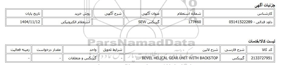 | داود فدائی - 05141522289 | 177460 | گیربکس SEW | استعلام الکترونیکی | 1404/11/12 |