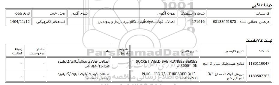 مرتضی جمالی شاد - 05138451875171616اتصالات فولادی/فولادآلیاژی/گالوانیزه درزدار و بدون درزاستعلام الکترونیکی1404/11/12