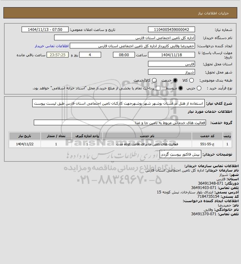 شرح کلی نیاز: استفاده از هتل در استان بوشهر شهر بوشهرجهت کارکنان تامین اجتماعی استان فارس طبق لیست پیوست