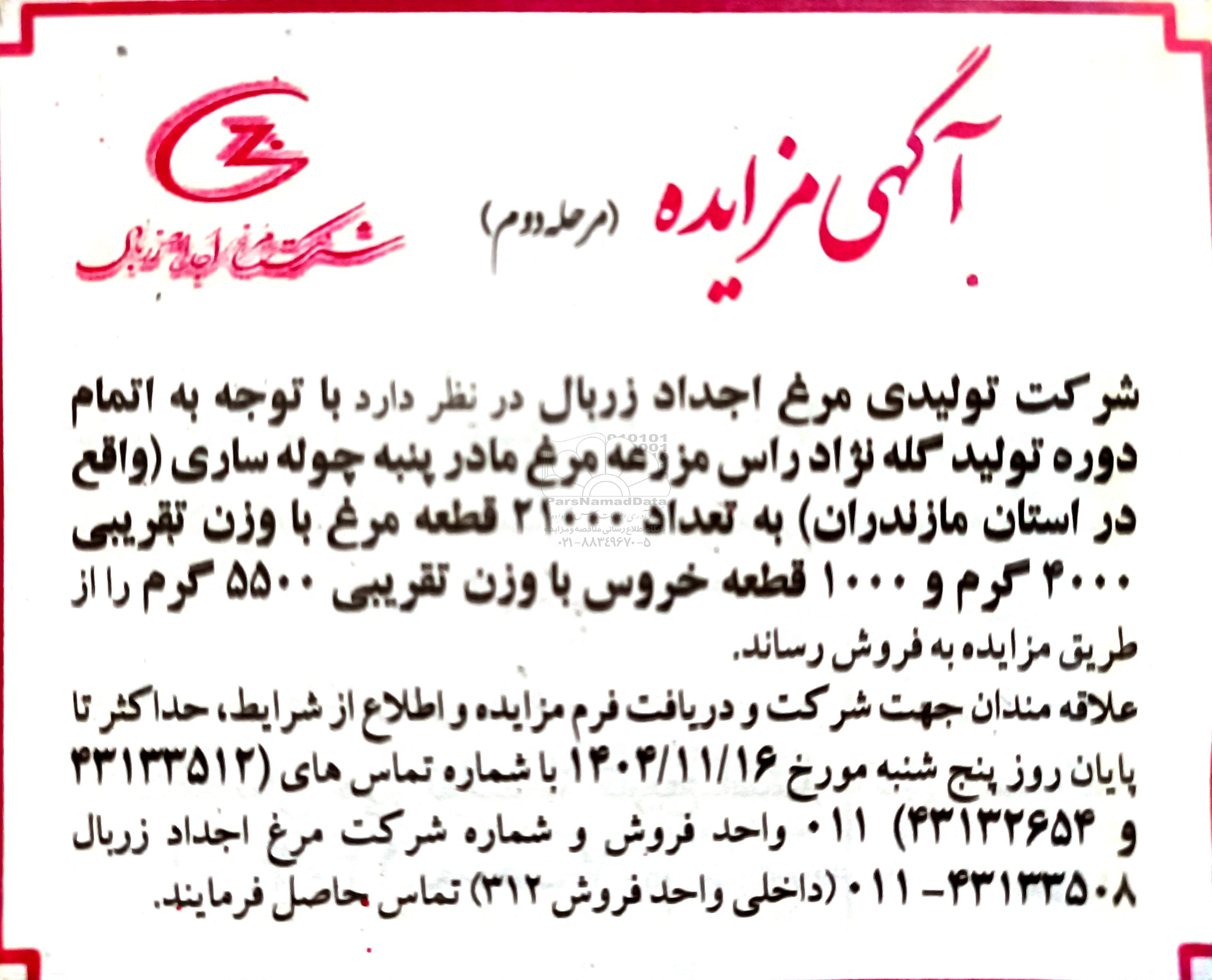 شرکت تولیدی مرغ اجداد زربال در نظر دارد با توجه به اتمام دوره تولید گله نژاد راس مزرعه مرغ مادر پنبه چوله سازی (واقع در استان مازندران) به تعداد 21000 قطعه مرغ با وزن تقریبی 4000 گرم و 1000 قطعه خروس با وزن تقریبی 5500 گرم را از طریق مزایده به فروش رساند.