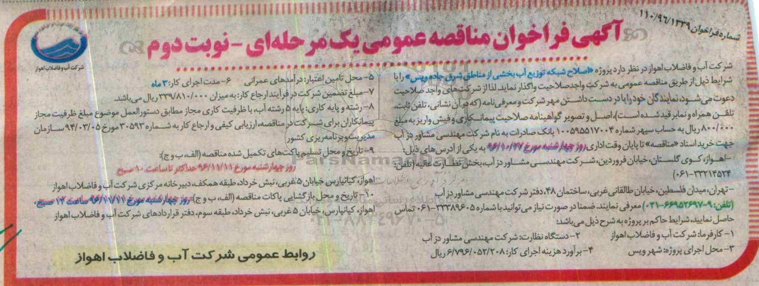شرکت آب و فاضلاب اهواز در نظر دارد پروژه اصلاح شبکه توزیع آب بخشی از مناطق شرق جاده ویس را با شرایط ذیل از طریق مناقصه عمومی به شرکت واجد صلاحیت واگذار نماید. لذا از شرکت های واجد صلاحیت دعوت می شود نمایندگان خوئد را با در دست داشتن مهر شرکت و معرفی نامه (که در آن نشانی، تلفن ثابت، تلفن همراه و نمابر قید شده است)، اصل و تصویر گواهینامه صلاحیت پیمانکاری و فیش واریز به مبلغ 800.000 ریال به حساب سپهر شماره 100595517004 بانک صادرات به نام شرکت مهندسی مشاور دز آب جهت خرید اسناد مناقصه تا پایان وقت اداری روز چهارشنبه مورخ 96.10.27 به یکی از آدرس های ذیل: