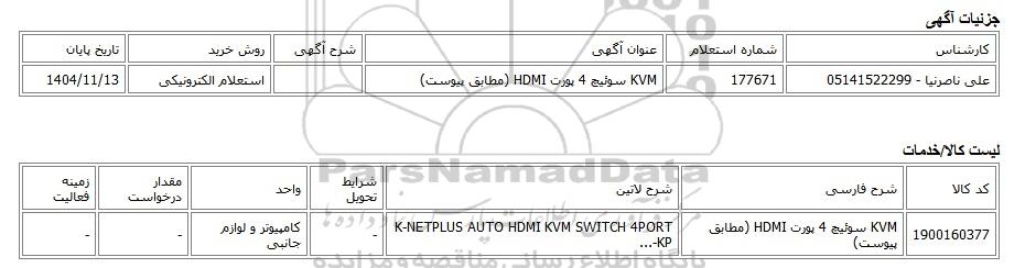 علی ناصرنیا - 05141522299177671KVM سوئیچ 4 پورت HDMI (مطابق پیوست)استعلام الکترونیکی1404/11/13