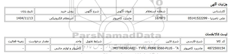 | علی ناصرنیا - 05141522299 | 167973 | مادربرد کامپیوتر | استعلام الکترونیکی | 1404/11/13 |