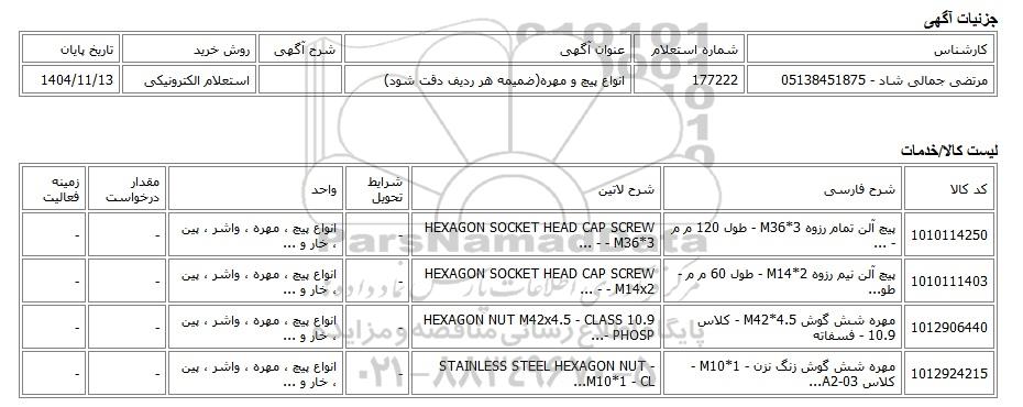 | مرتضی جمالی شاد - 05138451875 | 177222 | انواع پیچ و مهره(ضمیمه هر ردیف دقت شود) | استعلام الکترونیکی | 1404/11/13 |