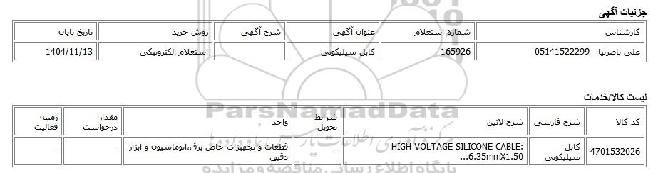 | علی ناصرنیا - 05141522299 | 165926 | کابل سیلیکونی | استعلام الکترونیکی | 1404/11/13 |