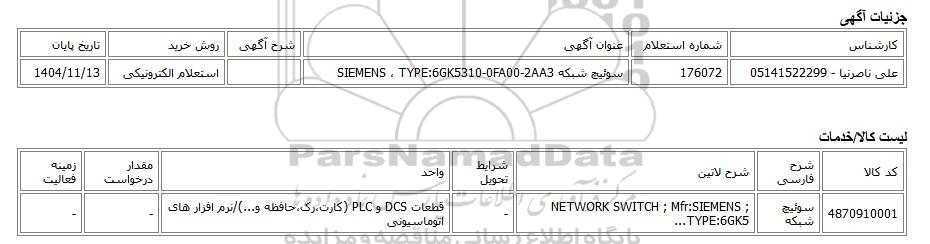 | علی ناصرنیا - 05141522299 | 176072 | سوئیچ شبکه SIEMENS ، TYPE:6GK5310-0FA00-2AA3 | استعلام الکترونیکی | 1404/11/13 |