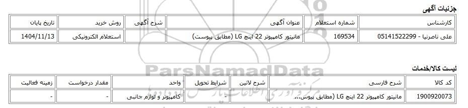 علی ناصرنیا - 05141522299169534مانیتور کامپیوتر 22 اینچ LG (مطابق پیوست)استعلام الکترونیکی1404/11/13