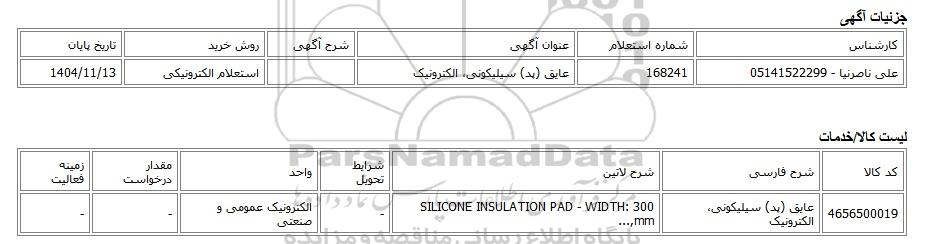 | علی ناصرنیا - 05141522299 | 168241 | عایق (پد) سیلیکونی، الکترونیک | استعلام الکترونیکی | 1404/11/13 |