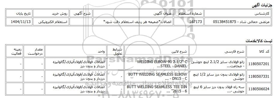 | مرتضی جمالی شاد - 05138451875 | 167173 | اتصالات*ضمیمه هر ردیف استعلام دقت شود* | استعلام الکترونیکی | 1404/11/13 |