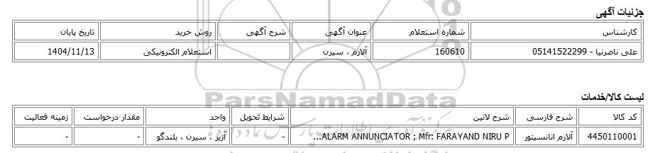 | علی ناصرنیا - 05141522299 | 160610 | آلارم ، سیرن | استعلام الکترونیکی | 1404/11/13 |