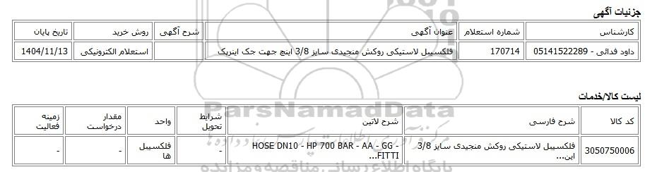 | داود فدائی - 05141522289 | 170714 | فلکسیبل لاستیکی روکش منجیدی سایز 3/8 اینچ جهت جک اینرپک | استعلام الکترونیکی | 1404/11/13 |