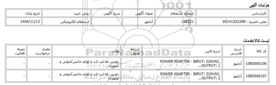| علی ناصرنیا - 05141522299 | 168221 | آداپتور | استعلام الکترونیکی | 1404/11/13 |