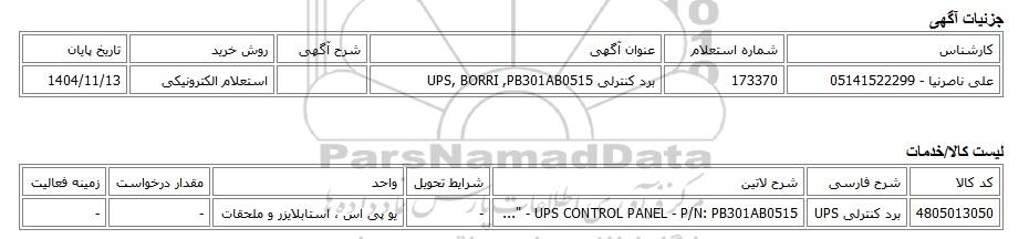علی ناصرنیا - 05141522299173370برد کنترلی UPS, BORRI ,PB301AB0515استعلام الکترونیکی1404/11/13