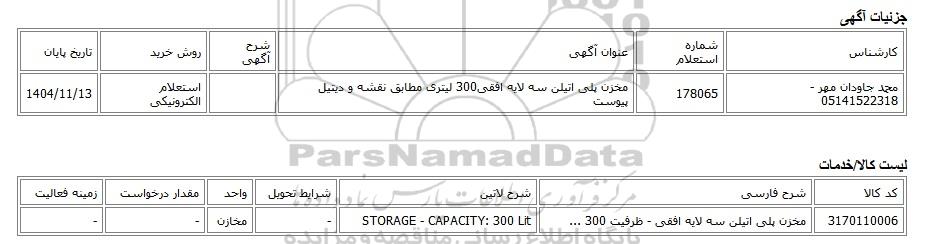 محمد جاودان مهر - 05141522318178065مخزن پلی اتیلن سه لایه افقی300 لیتری مطابق نقشه و دیتیل پیوستاستعلام الکترونیکی1404/11/13